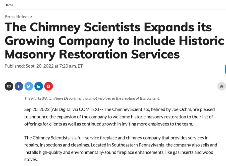 Sep 20, 2022 (AB Digital via COMTEX) — The Chimney Scientists, helmed by Joe Ochal, are pleased to announce the expansion of the company to welcome historic masonry restoration to their list of offerings for clients as well as continued growth in inviting more employees to the team.